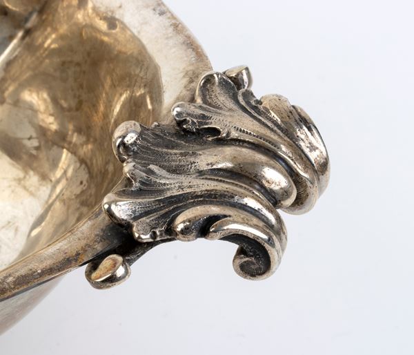 di forma ovale sagomata con prese vegetali laterali. Argento 800/1000, punzonato "800 - 32 marchio del fascio MI", argentiere DITTA MESSULAM ENRICO di Alberto.
