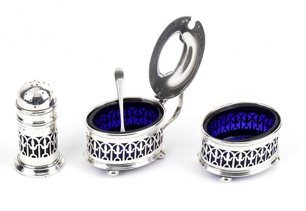 Saliera, pepiera e mostardiera inglesi in argento, Birmingham 1921-1922