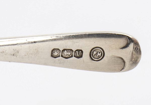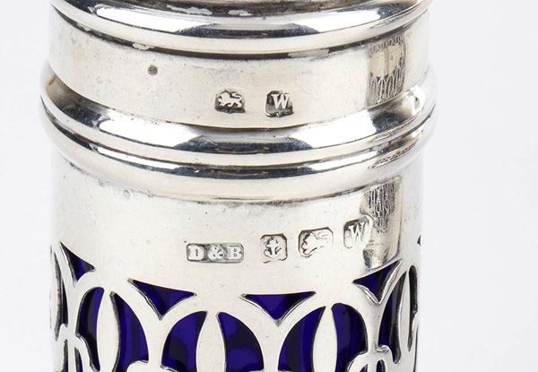 con bordo traforato a decori geometrici e contenitori in vetro blu. Argento 925/1000, serie completa di marchi Birmingham 1921-1922, argentieri Docker & Burn.