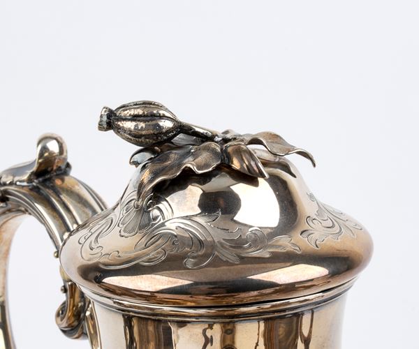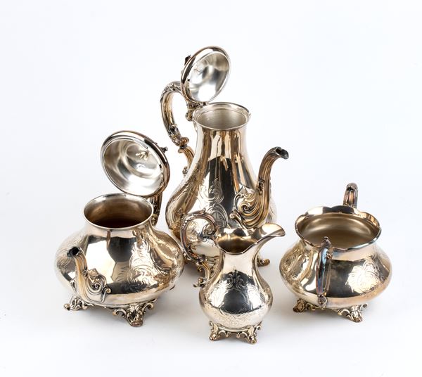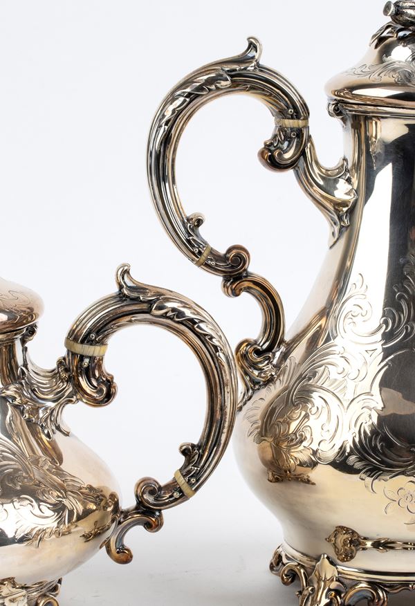 composto da caffettiera, teiera, zuccheriera e lattiera, a decori vegetali poggiante su quattro piedi fogliati. Argento 925/1000, serie completa di marchi Londra 1850-1851, argentieri Edward, John & William Barnard.
