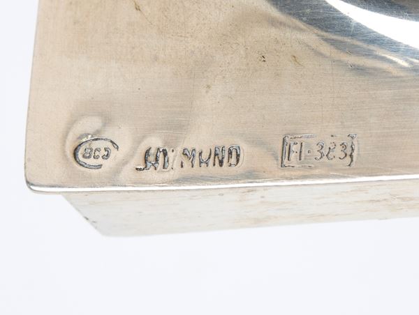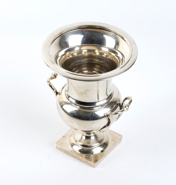 con base quadrata e manici laterali, alla base la seguente dedica: "A S.E. IL MINISTRO JOSE' FALDINI A RICORDO DELL'ASSOCIAZIONE DEGLI INDUSTRIALI MUGNAI E PASTAI D'ITALIA". Argento 800/1000, punzonata "800 - FI 383", argentiere FABBRICA ARGENTERIE ETRURIA di FRANCESCHINA. GIACHETTI, PARIGI & SANTONI S.n.c.
