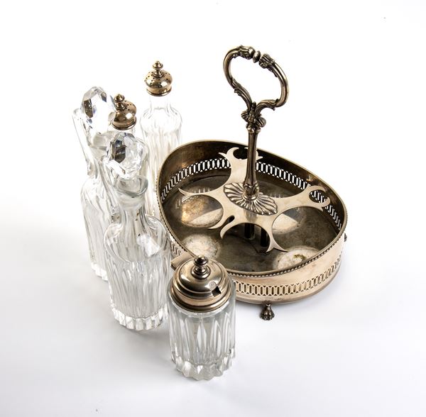 Una cruet italiana in argento con cinque bottiglie in vetro molato, XX secolo
