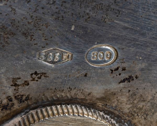di forma ovale con bordo traforato, presa centrale e piede ad artiglio. Argento 800/1000, punzonata "800 - 383 FI", argentiere FABBRICA ARGENTERIE ETRURIA di FRANCESCHINA. GIACHETTI, PARIGI & SANTONI S.n.c.