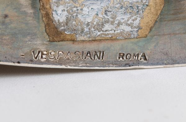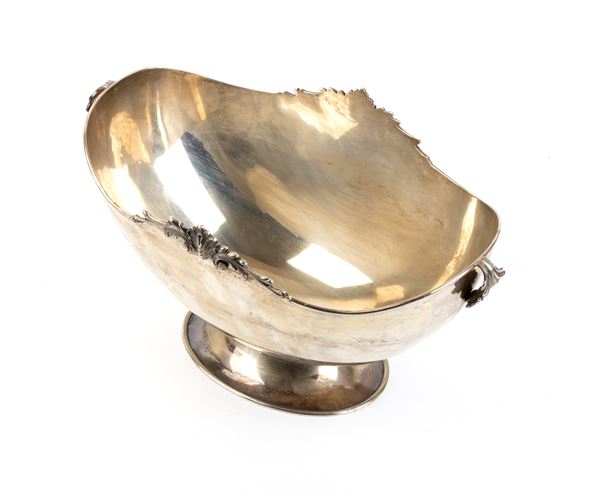 sagomato a casco, su base circolare con bordo a decorazioni vegetali. Argento 800/1000, punzonato "800 - 28 MI", argentiere FABBRICA ITALIANA ARGENTERIE di Alignani Pasquale & Alignani Mariano.