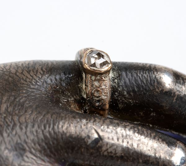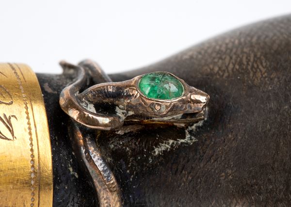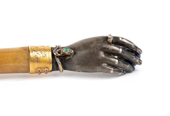 in corno di rinoceronte color marrone miele (Rhinocerotidae spp.) con impugnatura in argento 800/1000 raffigurante una mano che tiene una sfera di lapislazzuli, impreziosita da uno smeraldo sul polso e un anello di diamante di forma rotonda, taglio a rosa. La canna è lavorata a tronco d'albero. Punzonato con i marchi per i minuti lavori in uso in Francia dopo il 1838, argentiere GI.