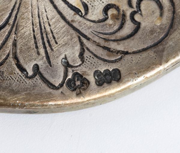 base circolare incisa con volute vegetali. Argento 800/1000, punzonati "800" argentiere Luigi Genazzi.