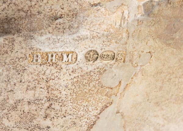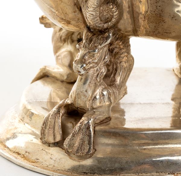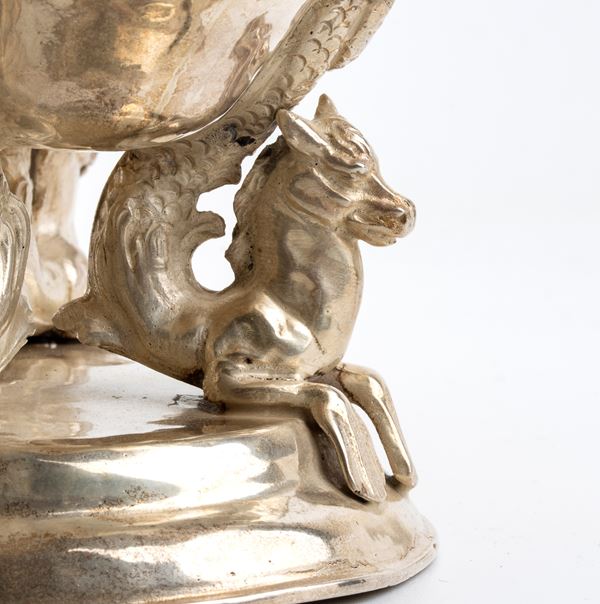 di forma sagomata, base ovale con quattro animali fantastici a sostenere una coppa sagomata. Argento 800/1000 punzonate con i marchi in uso ad Hannau dall'argentiere L. Neresheimer & Co., con i marchi di importazione in Francia in uso dal 1893 e con i marchi di importazione a Londra nel 1913-1914 importatore Berthold Hermann Muller.