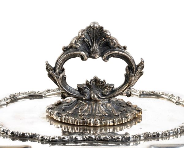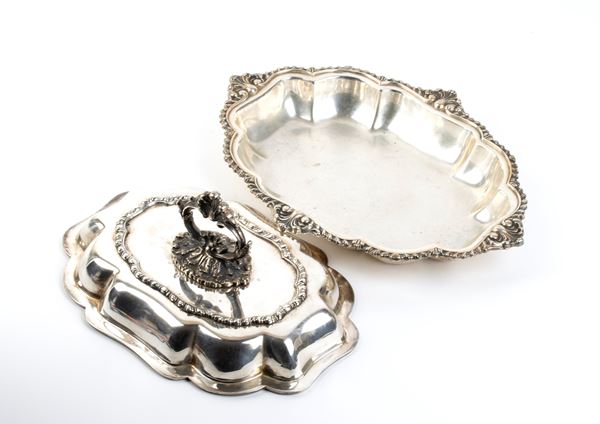 con bordi decorati a motivi vegetali e coperchio con presa folgiata. Argento 800/1000, punzonata "800".