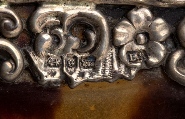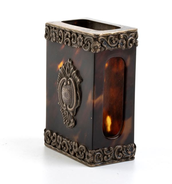 di forma rettangolare interamente in tartaruga (hawksbill sea turtle, Eretmochelys imbricata, Cheloniidae) con decorazione floreali in argento. Sul fronte il monogramma "NCE".