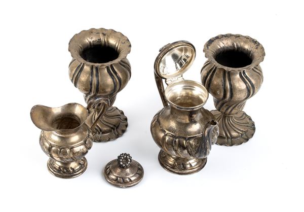 composto da una piccola caffettiera, una lattiera e due vasi a trombino. Argento 800/1000, punzonati "800".