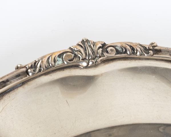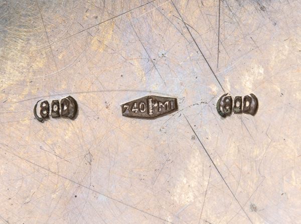 di forma rotonda con decori fogliati. Argento 800/1000, punzonato "800 - 240 marchio del fascio MI", argentiere Achille Proserpio.