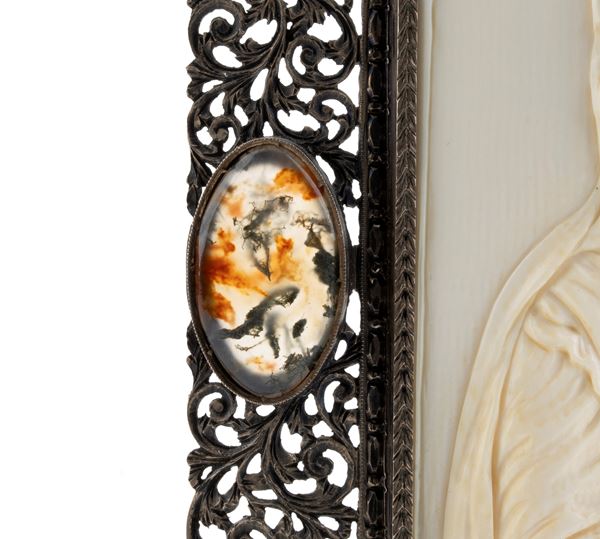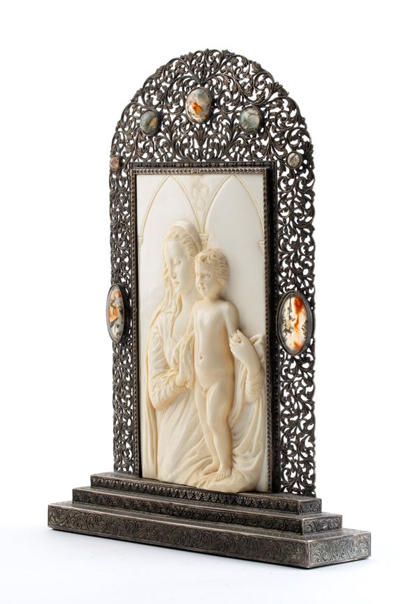 Scultura in avorio di elefante raffigurante Madonna con Bambino con cornice argento, Anni '30