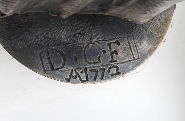 in argento da lastra, raffigurante San Vito, raffigurato a tutto tondo con un cane. Apparentemente non punzonato, testato con acido e pietra di paragone. Al verso in vasso l'iscrizione "D.G.F. - A 1772". Posto su un basamento in plexiglass.