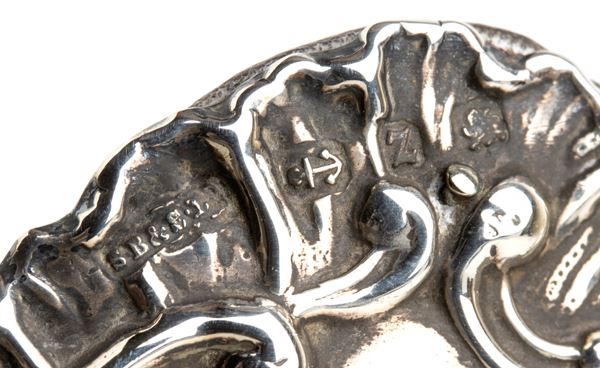 Argento 925/1000, serie completa di marchi Birmingham 1899-1900 e iniziali S B & S Ltd, argentiere Solomon Blanckensee & Son Ltd.