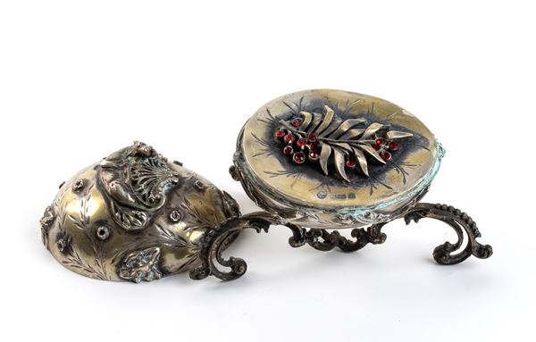 in argento fuso con coperchio ad innesto, decorato con festonii vegetali ed un felino, poggiante su un supporto a tripode con volute vegetali.