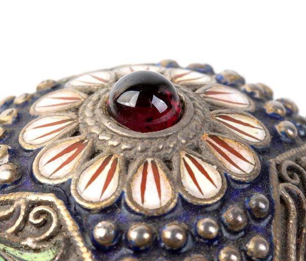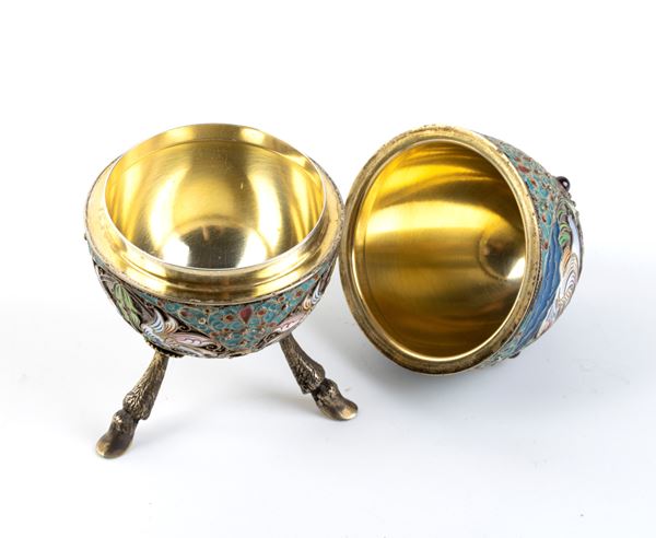 in argento dorato, apribile con chiusura ad innesto, decorato in policromia cigni e fogliame, poggiante su tre piedi a zoccolo animale.
