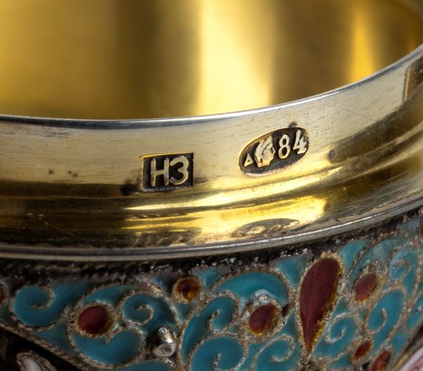 Punzonato con marchi apocrifi in uso a San Pietroburgo dal 1908 al 1917 per l'argento al titolo di 84 zolotnik (875/1000), marchi argentiere H3.