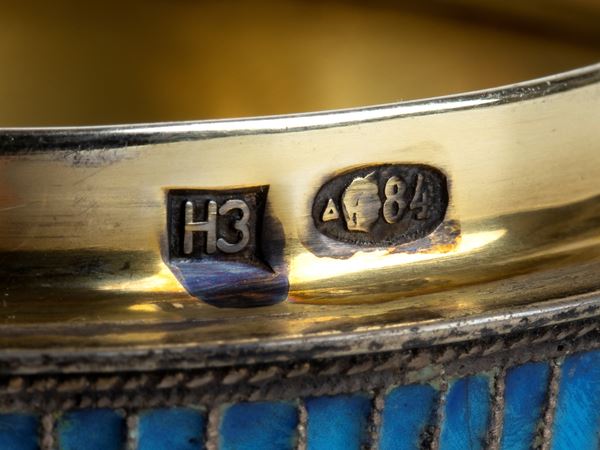 Punzonato con marchi apocrifi in uso a San Pietroburgo dal 1908 al 1917 per l'argento al titolo di 84 zolotnik (875/1000), marchi argentiere H3.