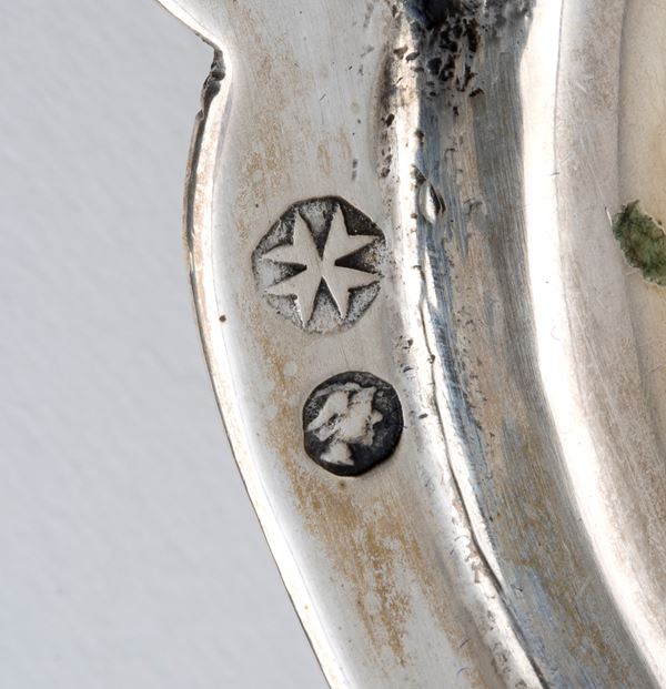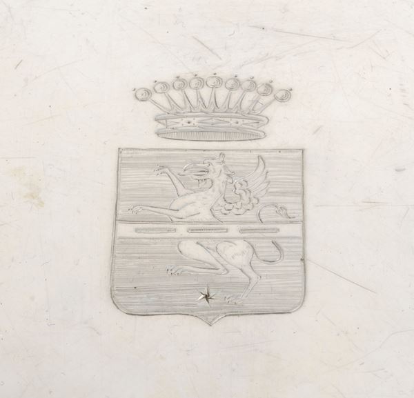 di forma rotonda con bordo gradinato e stemma nobiliare. Punzonato con marchi non identificati.
