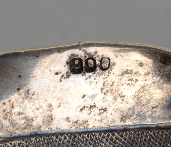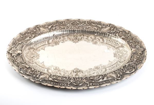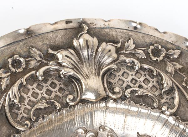 di forma ovale sbalzato con motivi floreali. Argento 800/1000, punzonato "800".