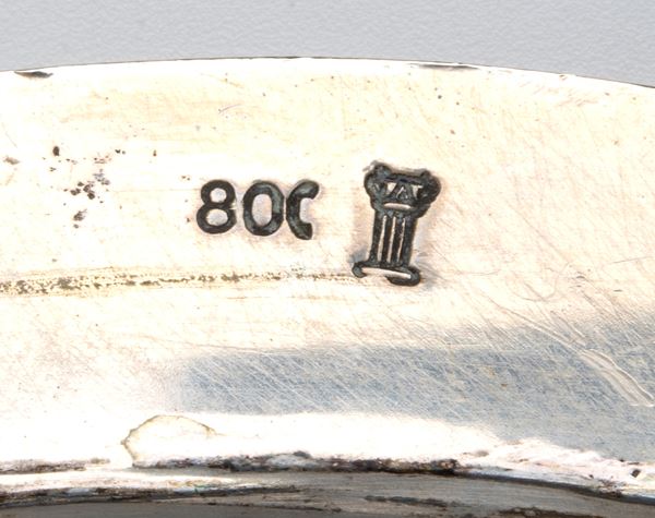 di forma ovale, con manici laterali. Argento 800/1000, punzonato "800".