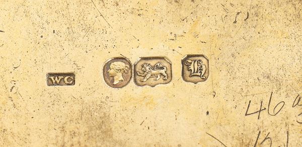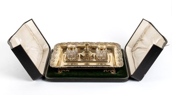 vassoio rettangolare, bordo perimetrale con ornamenti floreali e fogliati che continuano sui quattro piedi; dotato di tre supporti cilindrici, portacandele removibile al centro affiancato da una coppia di contenitori in vetro molato per l'inchiostro e la sabbia, ciascuno con coperchio in argento dorato. Sul davanti, un portapenne con cresta nobiliare. Argento dorato 925/1000, serie completa di marchi Londra 1843-1844, argentiere William Cumming.