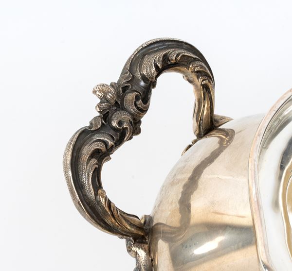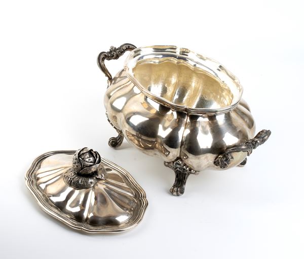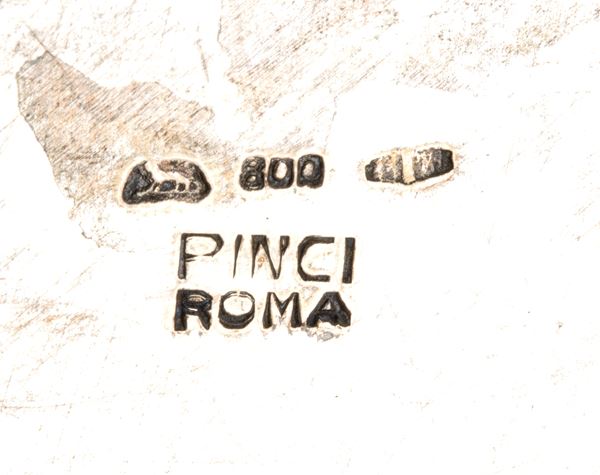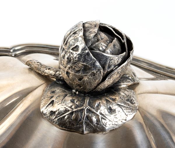 di forma ovale con corpo bombata, manici laterali a motivi vegetali, coperchio con presa a forma di rosa. Argento 800/1000, punzonata "800 - PINCI ROMA - marchio del fascio".