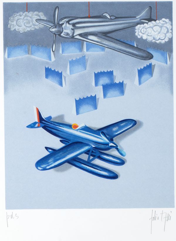Litografia a colori su carta ufficiale con timbro a secco in rilievo ALITALIA , raffigurante due velivoli MACCHI Castoldi (idrocorsa) , firmata in basso a destra a matita dall'autore e siglata "PDS" in basso a sinistra (Prova di Stampa). In cornice coeva, ottime condizioni. Anni '70