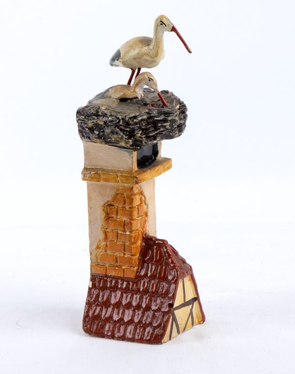 Cicogne nel nido costruito sul comignolo di un tetto di abitazione, dipinta a mano, marchio non leggibile, realizzata in composizione. Metà XX secolo. Misure cm.14 di altezza, ottime condizioni