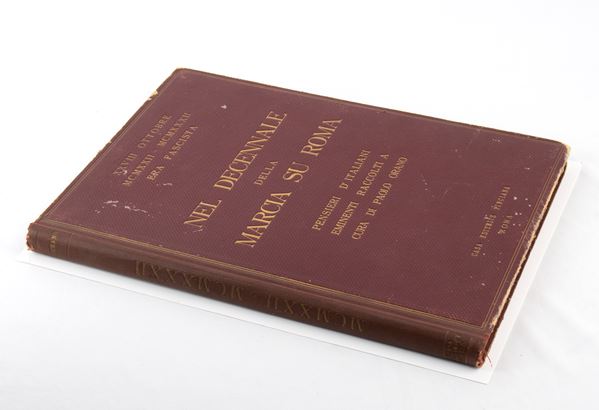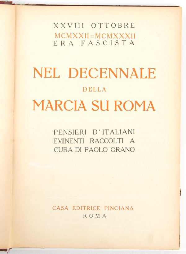 NEL DECENNALE DELLA MARCIA SU ROMA PENSIERI D' ITALIANI EMINENTI RACCOLTI A CURA DI PAOLO ORANO - CASA EDITRICE PINCIANA ROMA 1932 Era Fascista - pagine 148 - Copertina rigida - Dimensioni cm. 32x23 circa - Lievi segni d'uso sulla copertina , interno in ottime condizioni