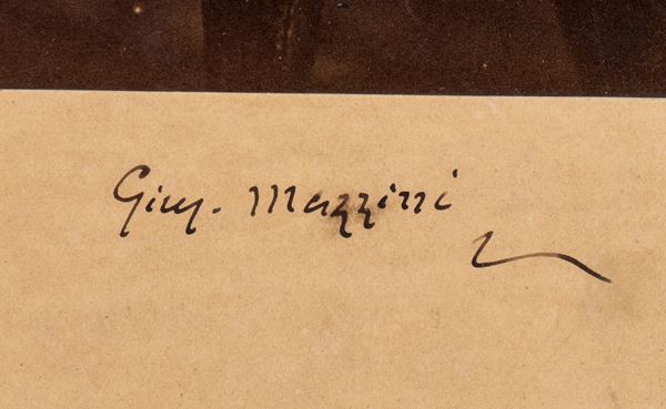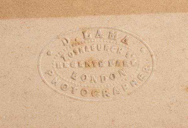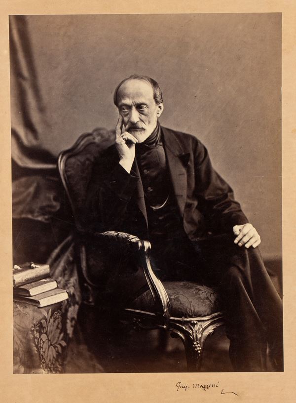 Foto autografa di Giuseppe Mazzini. Grande foto b/n con passepartout "finto" montata su cartoncino. Autografo "Gius.Mazzini" originale, inchiostro nero (in calce sul "passepartout" finto, intorno alla foto). Timbro a secco ovale che riporta in rilievo i dati del fotografo "D.LAMA PHOTOGRAPHER / J. Osnaburgh St. / REGENTS PARK / LONDON" a testimonianza della permanenza londinese di Mazzini. Misure della foto cm.25,5x33,4 il cartoncino misura cm.40,8x48 - In perfette condizioni, bordi del cartoncino con usura e tagli. Al retro del cartoncino appunto ad inchiostro nero "D.LAMA PHOTOGRAPHER - 45 Brompton Square - LONDON"