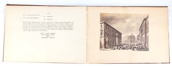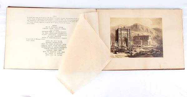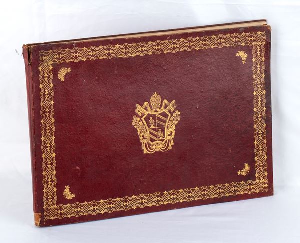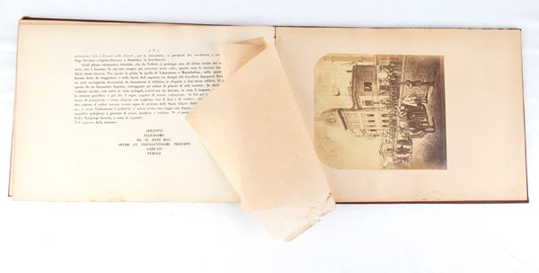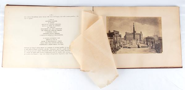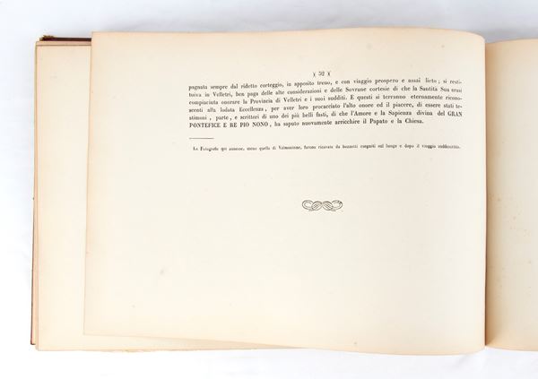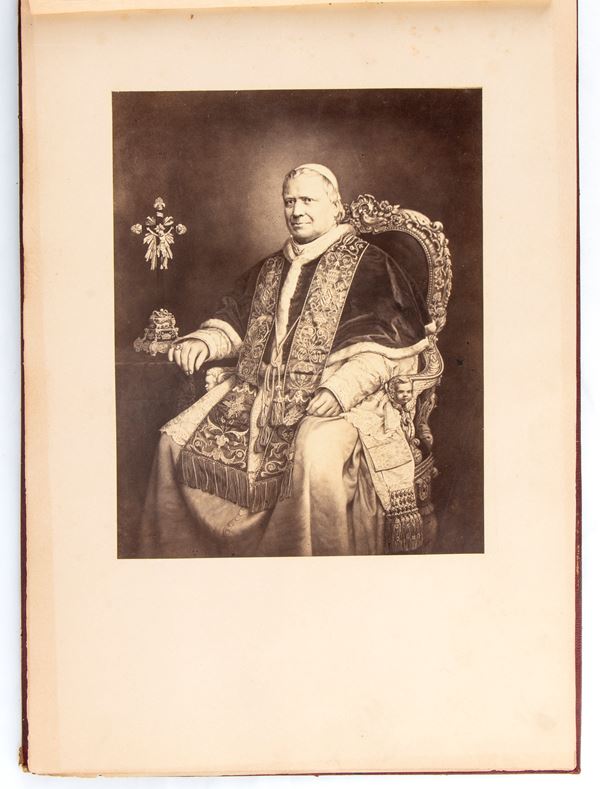 Rarissimo documento bibliografico, in formato oblungo, misure circa cm.28x41 , legatura coeva in piena tela copertina rigida in similpelle rossa, piatti impressi a secco in oro con stemma pontificio Mastai Ferretti al centro e cornice ed angoli a richiami floreali, pagine 52 più una bianca alla fine, grande foto cm.18x23 protetta da velina di Sua Santità PIO IX all'antiporta, 7 foto e riproduzioni artistiche (albumina) f.t. con veline di protezione. Frontespizio a caratteri neri "VIAGGIO DI SUA SANTITA' PAPA PIO IX NELLA CITTA' E PROVINCIA DI VELLETRI / SCRITTO E COMPILATO / DAL CANONICO LUIGI ANGELONI / VELLETRI / TIPOGRAFIA DI ANGELO SARTORI E COMP. / 1863"