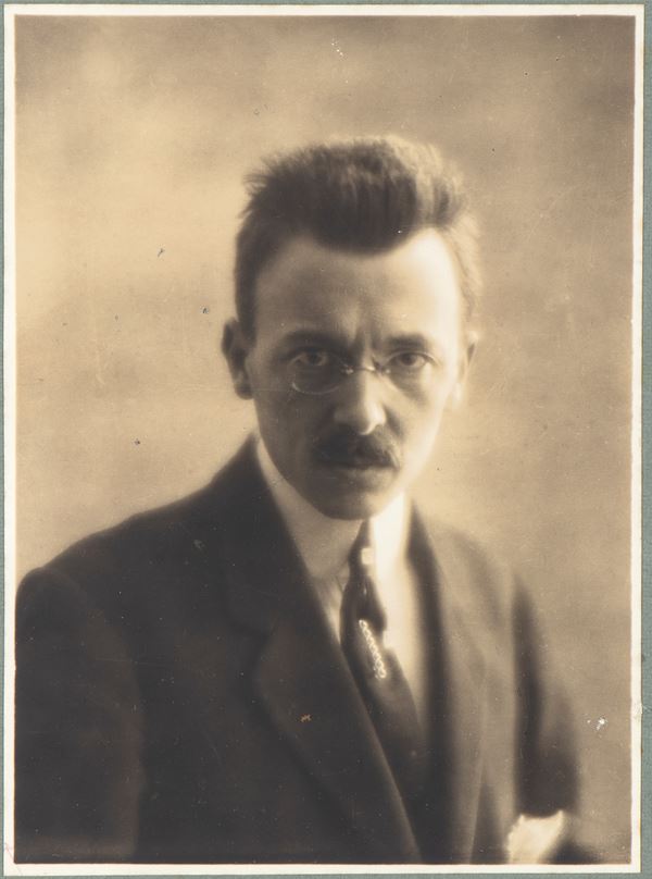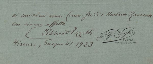Foto in b/n del compositore Ildebrando Pizzetti, montata su cartoncino grigio, con dedica e firma autografe. La dedica al "Carissimi amici Comm. Guido e Umberto Rousseau con sincero affetto - Ildebrando Pizzetti - Firenze Pasqua del 1923" - Foto timbrata Cav.Uff. L.Vaghi - Parma. Misure della sola immagine cm.16,5x22,6 il tutto in ottime condizioni
