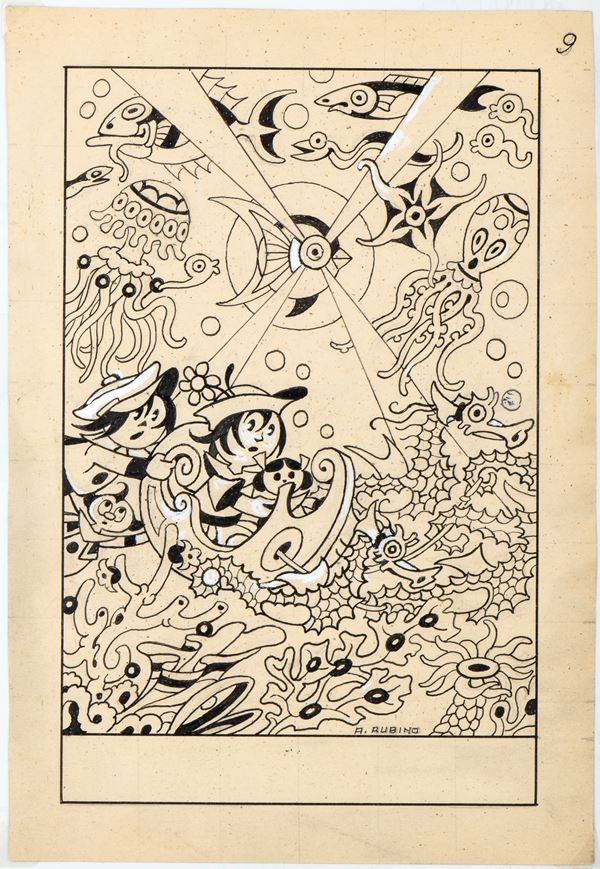Bella tavola originale disegnata da Antonio Rubino, illustratore fumettista del '900, per una storia a fumetti (per il Corriere dei Piccoli) o un libro di favole. Realizzata ad inchiostro di china, con correzioni in bianco, firmata in basso a destra A.RUBINO , con numero di story board "9" in alto a destra. In eccellenti condizioni, il foglio misura cm.17x25
