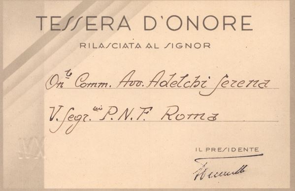 Al fronte "TESSERA D'ONORE rilasciata al signor On.Comm.Avv.Adelchi Serena V.Segr.rio P.N.F. Roma" per la Esposizione alla XVI Fiera di Milano del 1935. Cartoncino stampato a tonalità grigie, misura cm.7,8x11,8 , in perfette condizioni
