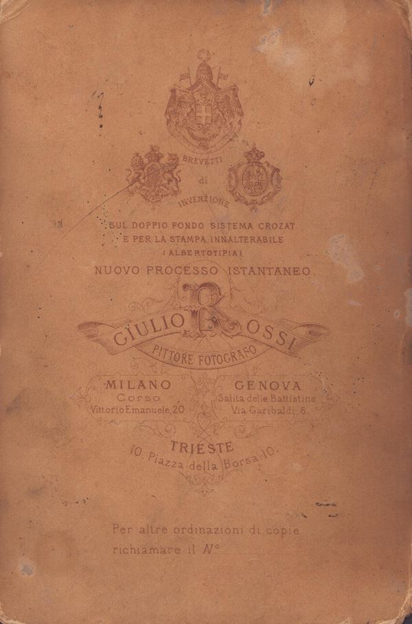 Foto b/n (albertotipia) formato margherita montata su cartoncino cm.11x16,5 periodo 1870. Al retro marcata Giulio Rossi Pittore Fotografo , Milano, Genova. Segni del tempo agli angoli, carta leggermente scurita, discrete condizioni