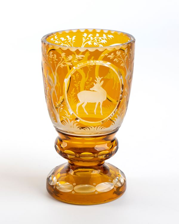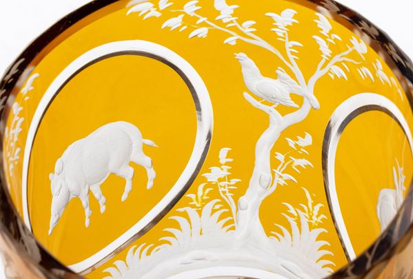 di colore giallo, molato e inciso con decori floreali e animali in stile Biedermeier.