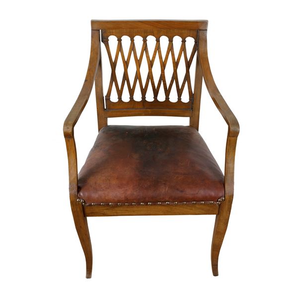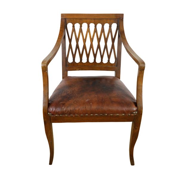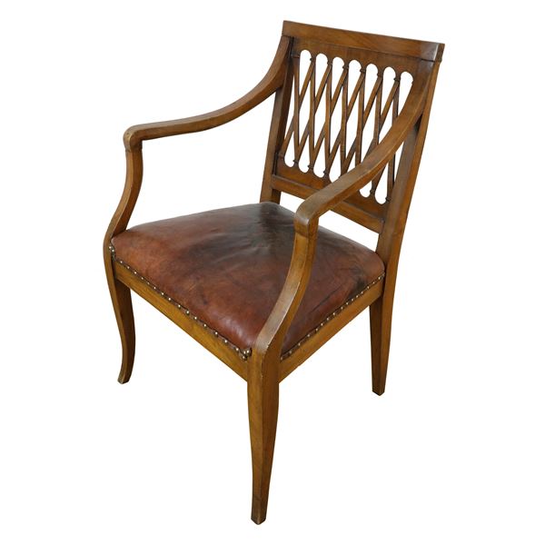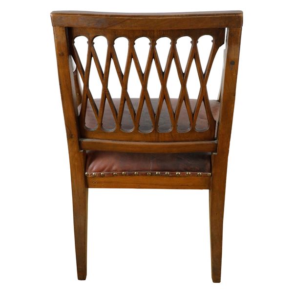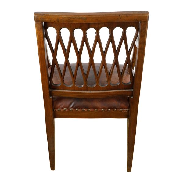 in legno di noce, con spalliera in legno con traverse in legno intrecciate. Seduta in pelle.