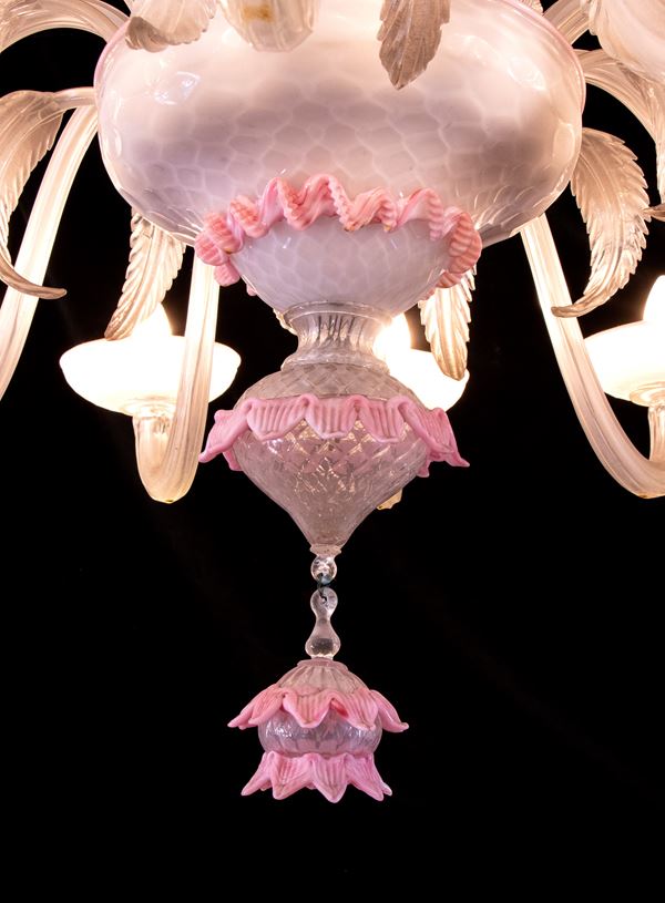 a 18 luci, di grandi dimensioni e sui colori del rosa , con parti in vetro soffiato a forma di fiori.