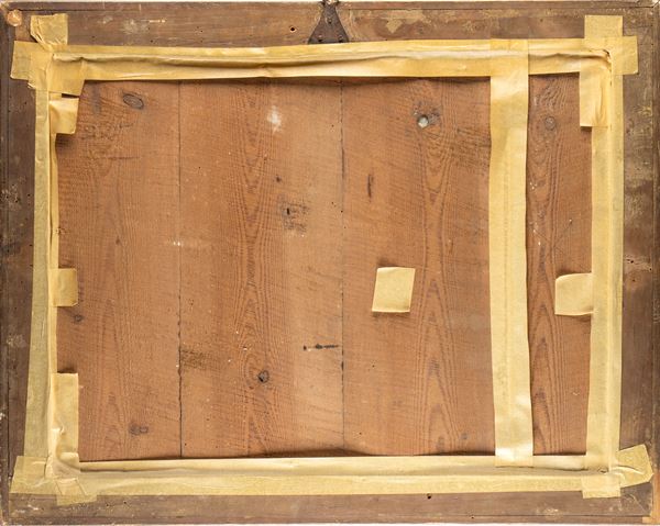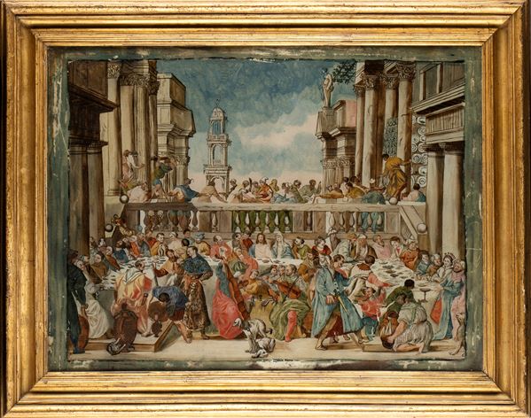 un “reverse panting”, dipinto sul retro del vetro raffigurante “le nozze di Cana” prima metà del 700 in cornice romana dorata coeva.