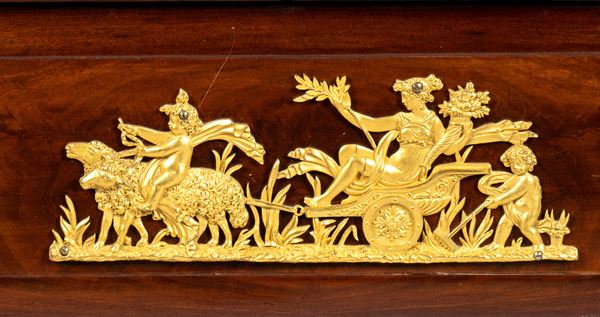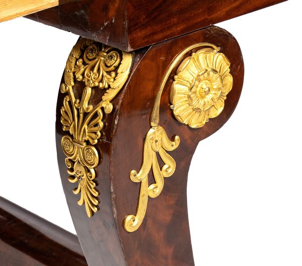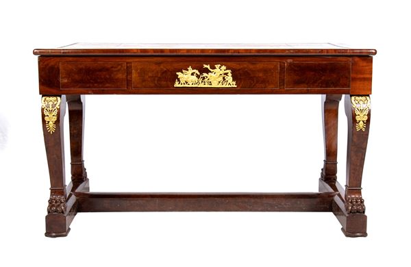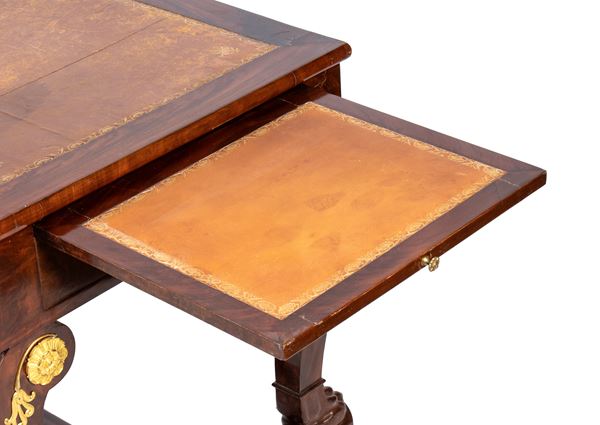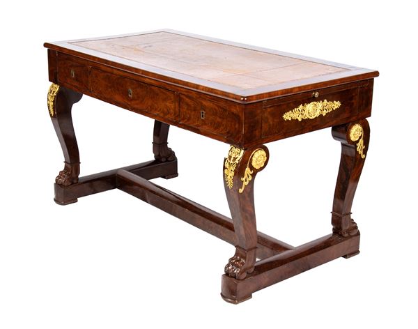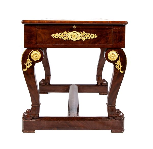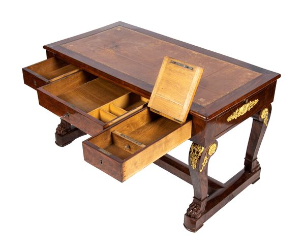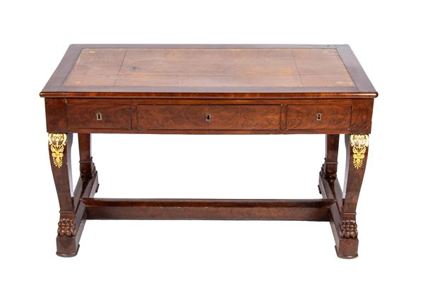 fronte con tre cassetti, con applicazioni in bronzo dorato. Piano in pelle.