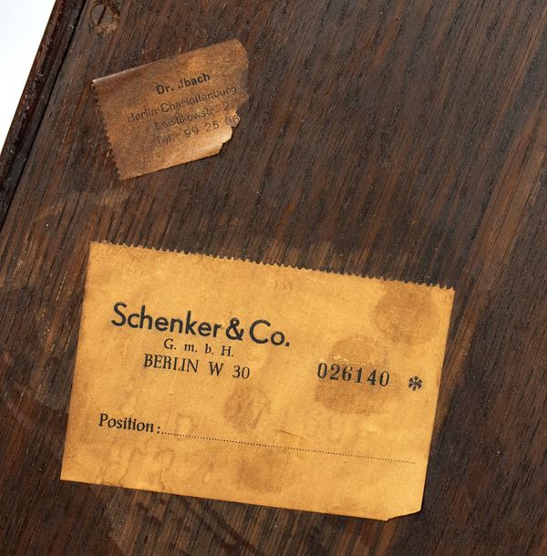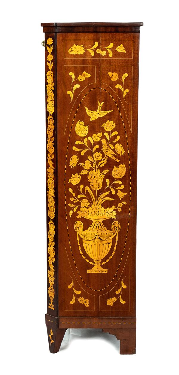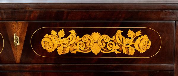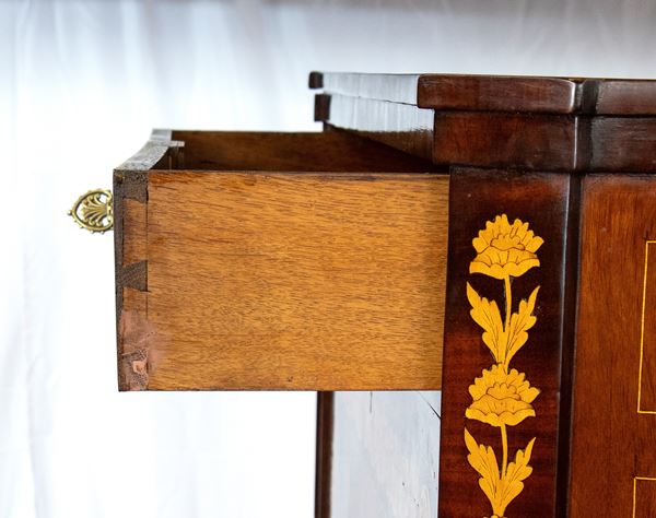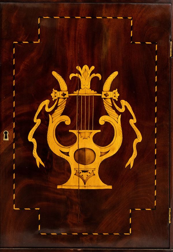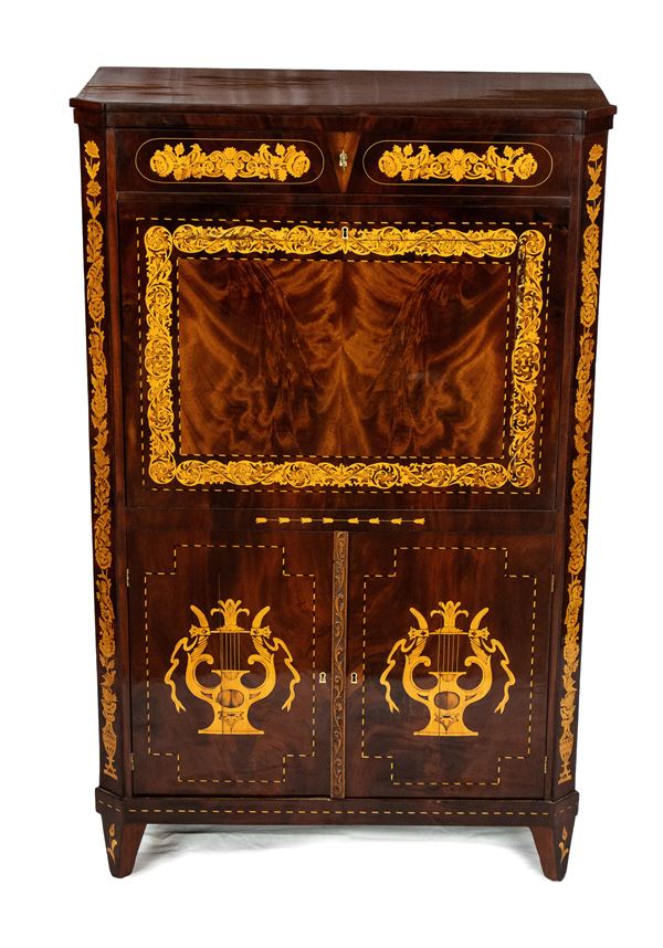 in mogano con intarsi floreali in legno di acero, a due ante nella parte inferiore con ribalta superiore e cassetto sotto il piano superiore; ferramenta originale.