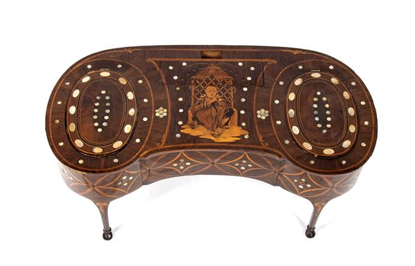 Tavolino - scrittoio italiano intarsiato in legni di frutto e madreperla, XVIII secolo