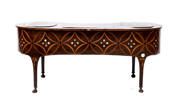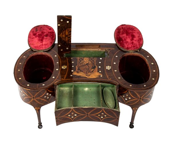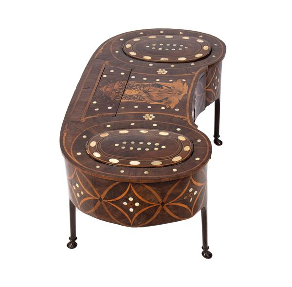 di area piemontese, il tavolino - scrittoio, finemente intarsiato, cela vani e segreti a scomparsa. Al centro del piano è presente un intarsio raffigurante una figura orientale, seguendo la moda dell'epoca.
