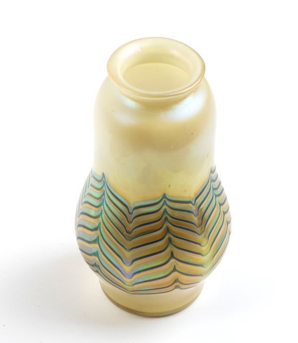 in vetro soffiato con decorazioni a onde filiformi in smalto rilucente verde argento.