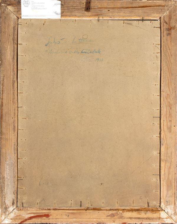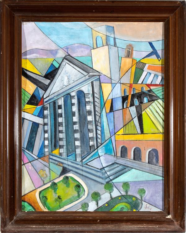 Firmato in basso a destra: Sibò, firmato, datato e titolato al retro: Sibò, Littoria, Acrobazie sulla Cattedrale, 1937 ed etichetta della Galleria Arte Centro di Milano