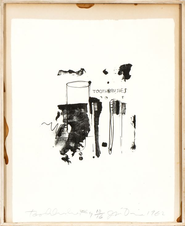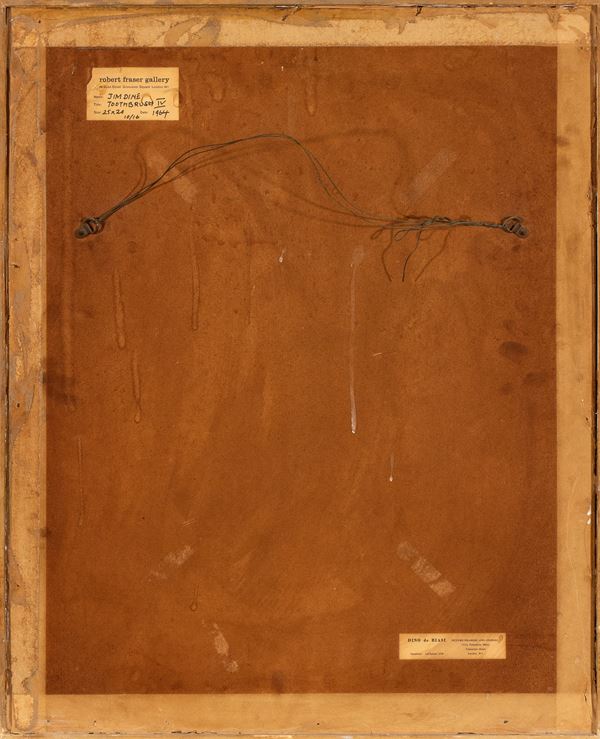 Titolo, tiratura, firma e data in basso: Toothbrushes #4, 10/16, Jim Dine, 1962; al retro etichetta della Robert Fraser Gallery di Londra