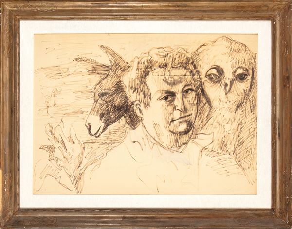 Bellissimo e grande disegno di Carlo Levi databile intorno agli anni '50 con autoritratto al centro. Il gufo alla destra è presente in molti disegni e quadri dell'epoca e rappresenta il pittore stesso, sia per la sua fisionomia ma anche per significati simbolici ed esoterici legati alla cultura ebraica. A Palazzo Altieri, dove il pittore viveva in quel periodo, Levi possedeva un gufo chiamato Graziadio. Nell'opera è raffigurato anche un asino, presenza evocativa della Lucania tra esilio e ritorni dopo la guerra.