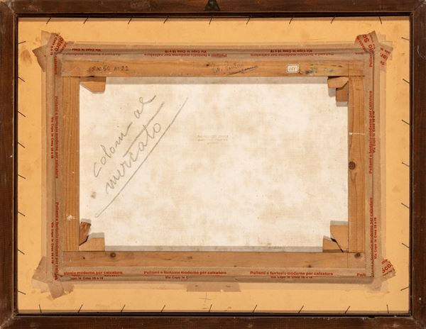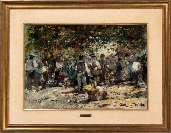 Firmato e dtato in basso a destra: F. Rontini, 58; titolato al retro: Coloni al mercato e timbro del Prof. Ferruccio Rontini, Livorno