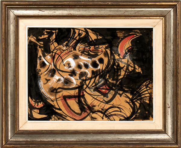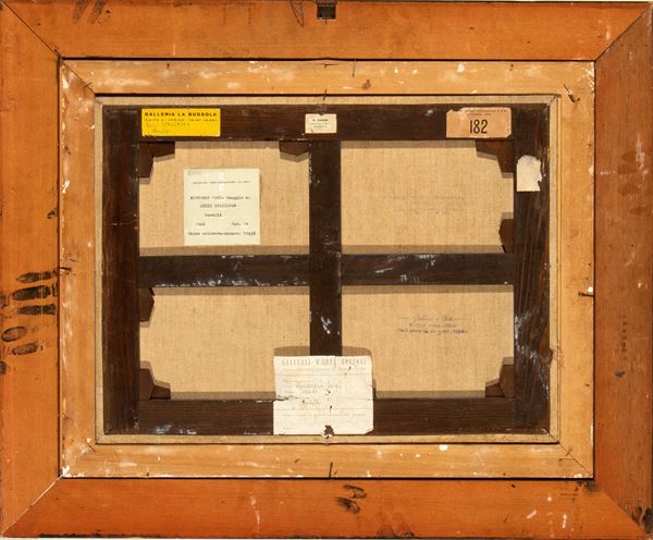 Al retro varie etichette: Galleria Gissi di Torino, Galleria La Bussola di Torino, Galleria d'arte Bottoni di Torino, Biennale Internazionale d'arte di Venezia del 1954, timbro della Galleria d'arte Bottoni di Torino